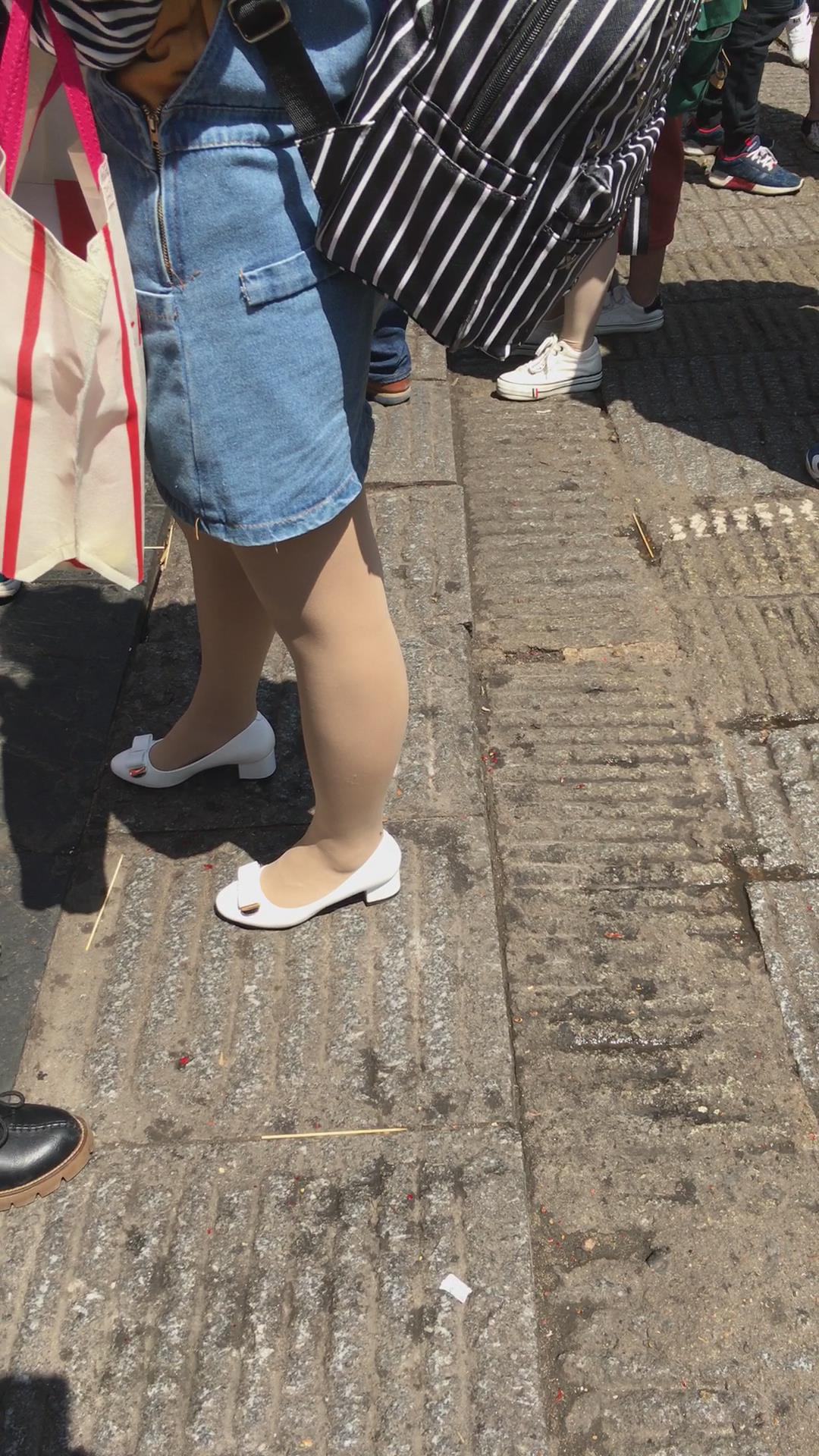 肉丝袜白色高跟鞋牛仔裙街拍美女 编号2175