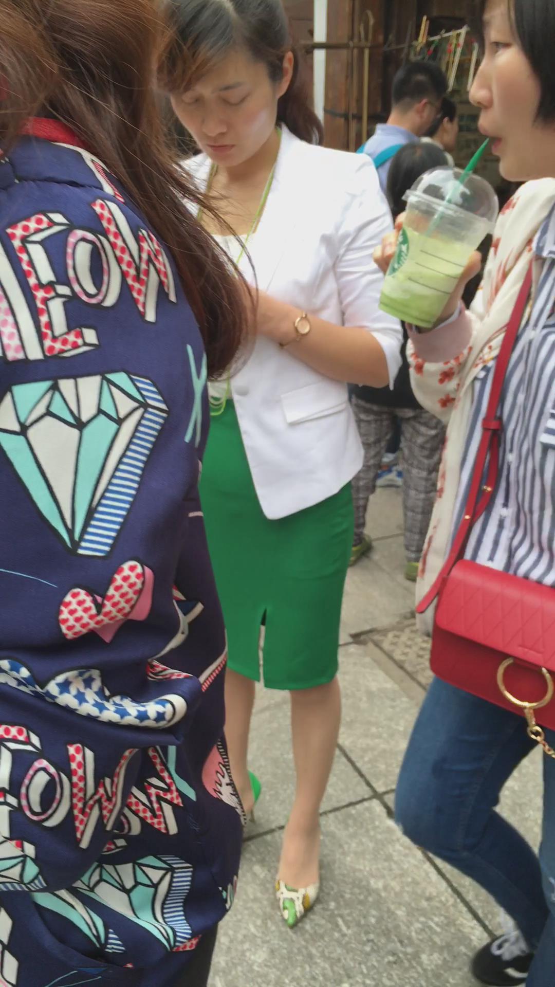 街拍绿色OL包臀裙高跟鞋轻熟女,很有韵味 编号2360