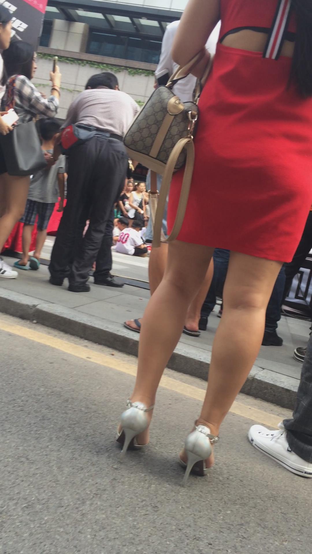 街拍美臀光腿高跟鞋的红色连衣裙少妇 编号2427