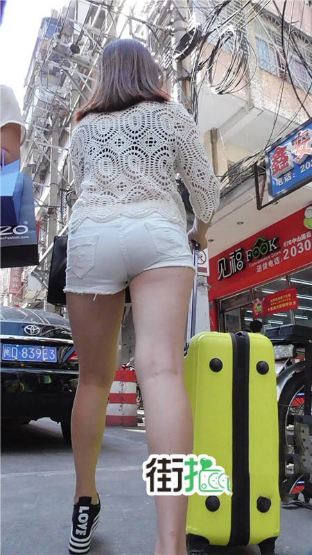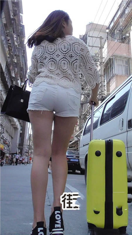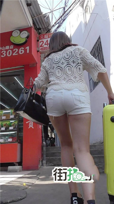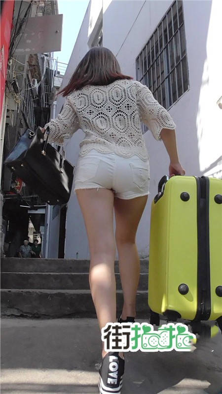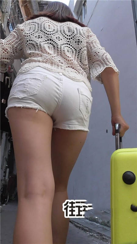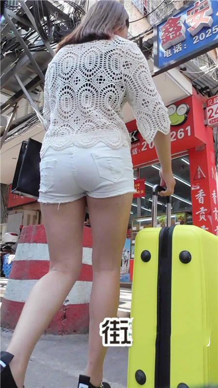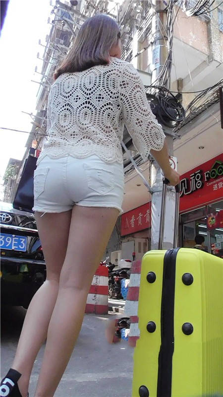 【编号723】街拍提旅行箱的白色热裤长腿MM