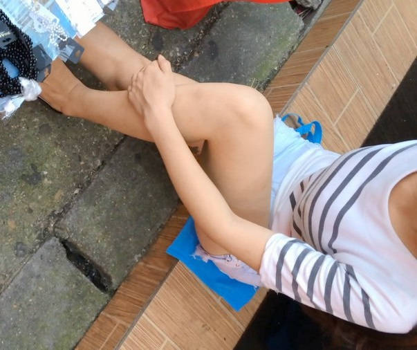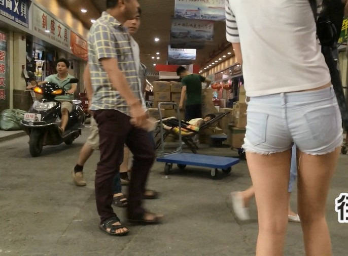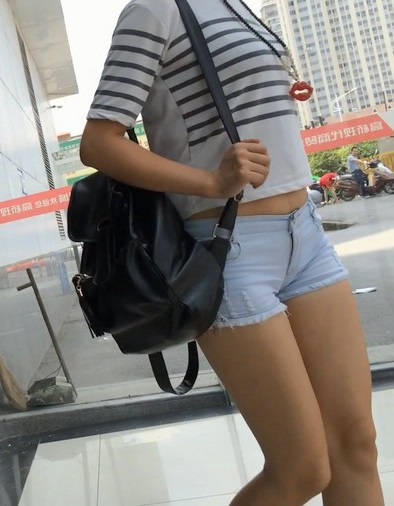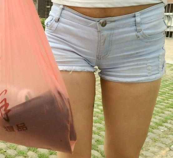 【编号870】街拍牛仔热裤少妇带小孩扫货