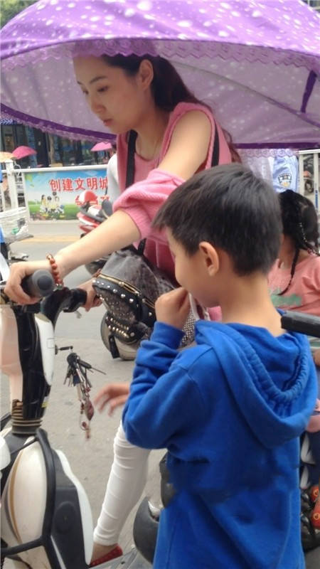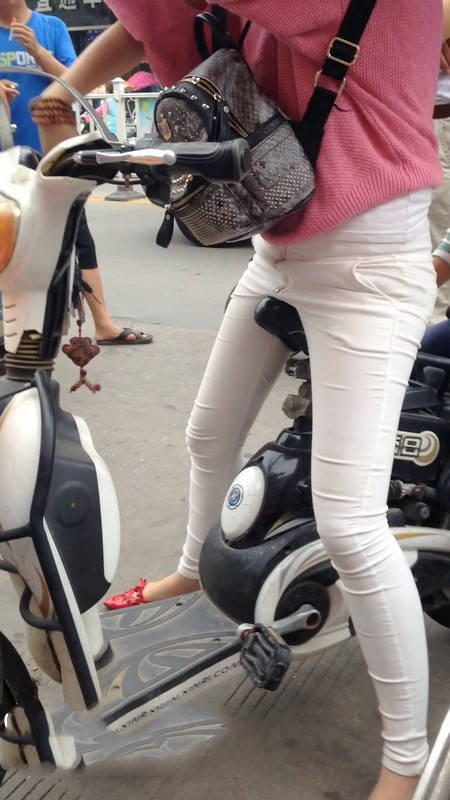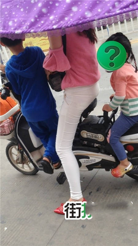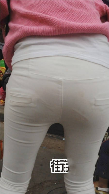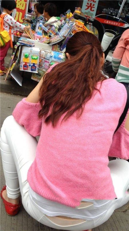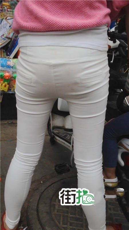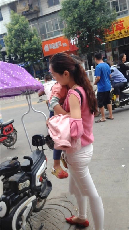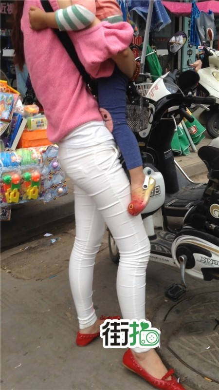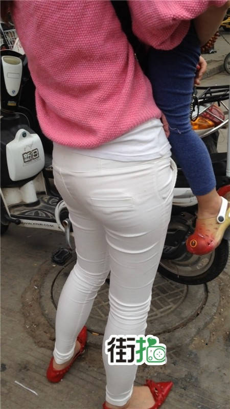 【编号1077】街拍白裤漂亮妈妈接宝宝回家