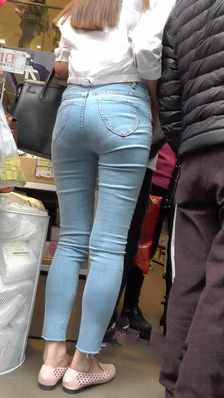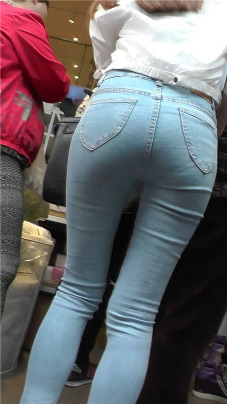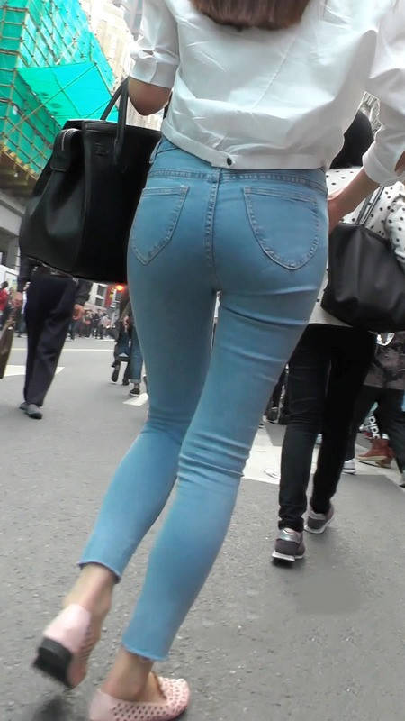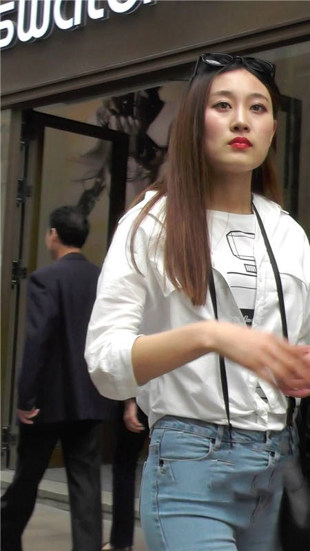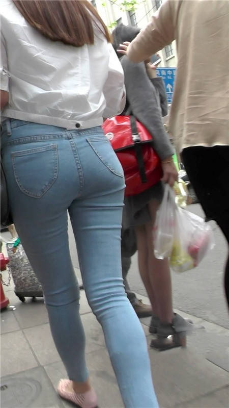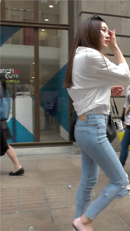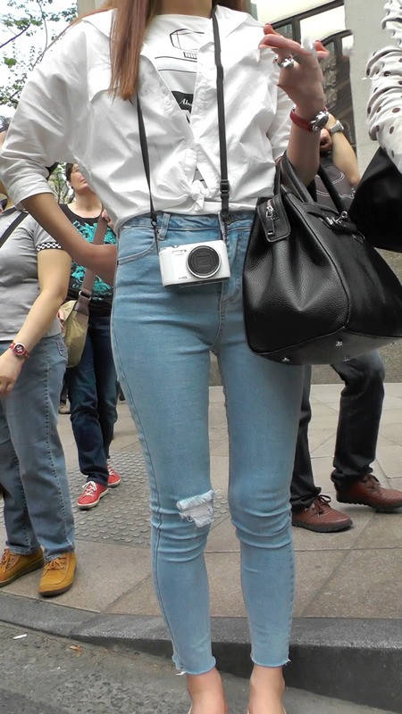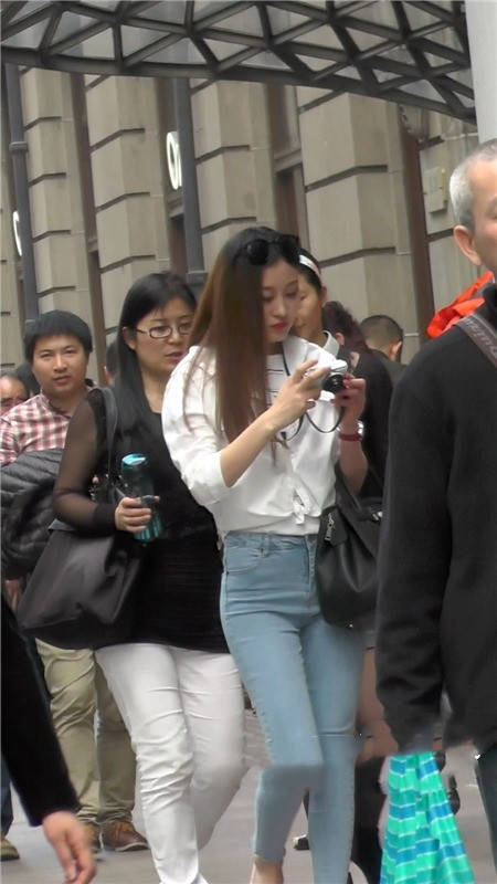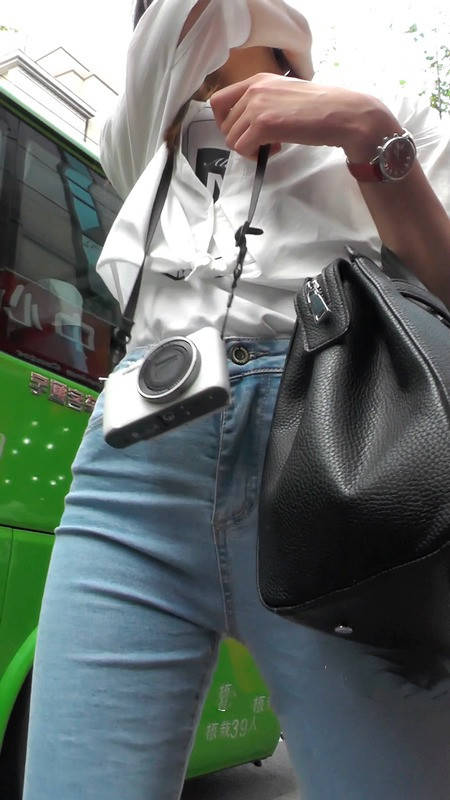 【编号1088】街拍紧身牛仔裤美女胸口挂着相机