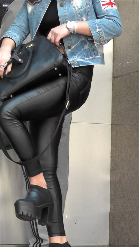 【编号1105】街拍黑色紧身皮裤露脐女孩