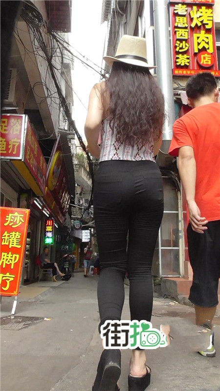 【编号729】街拍戴草帽的黑色紧身裤少妇