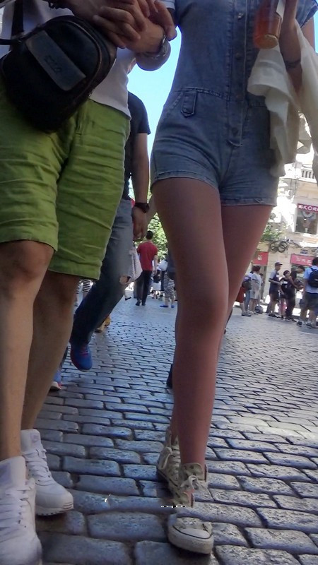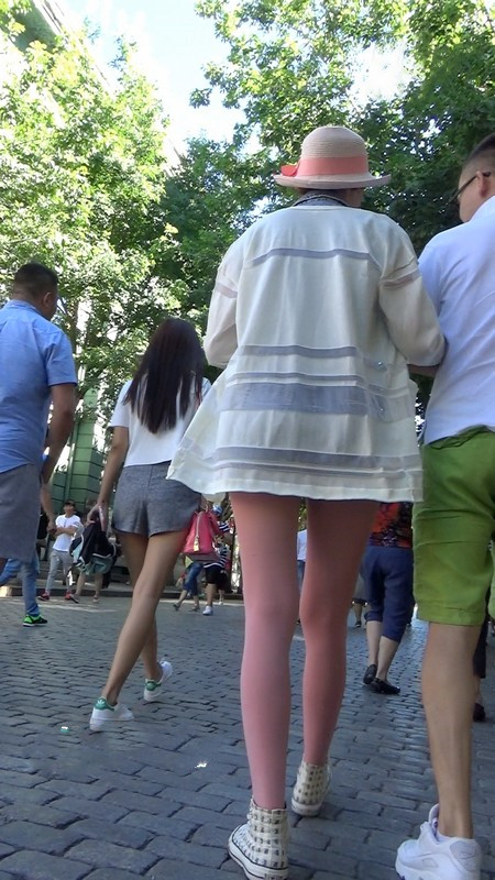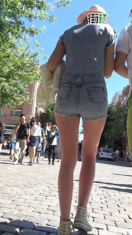 【编号1045】街拍粉色丝袜牛仔背带裤长腿MM