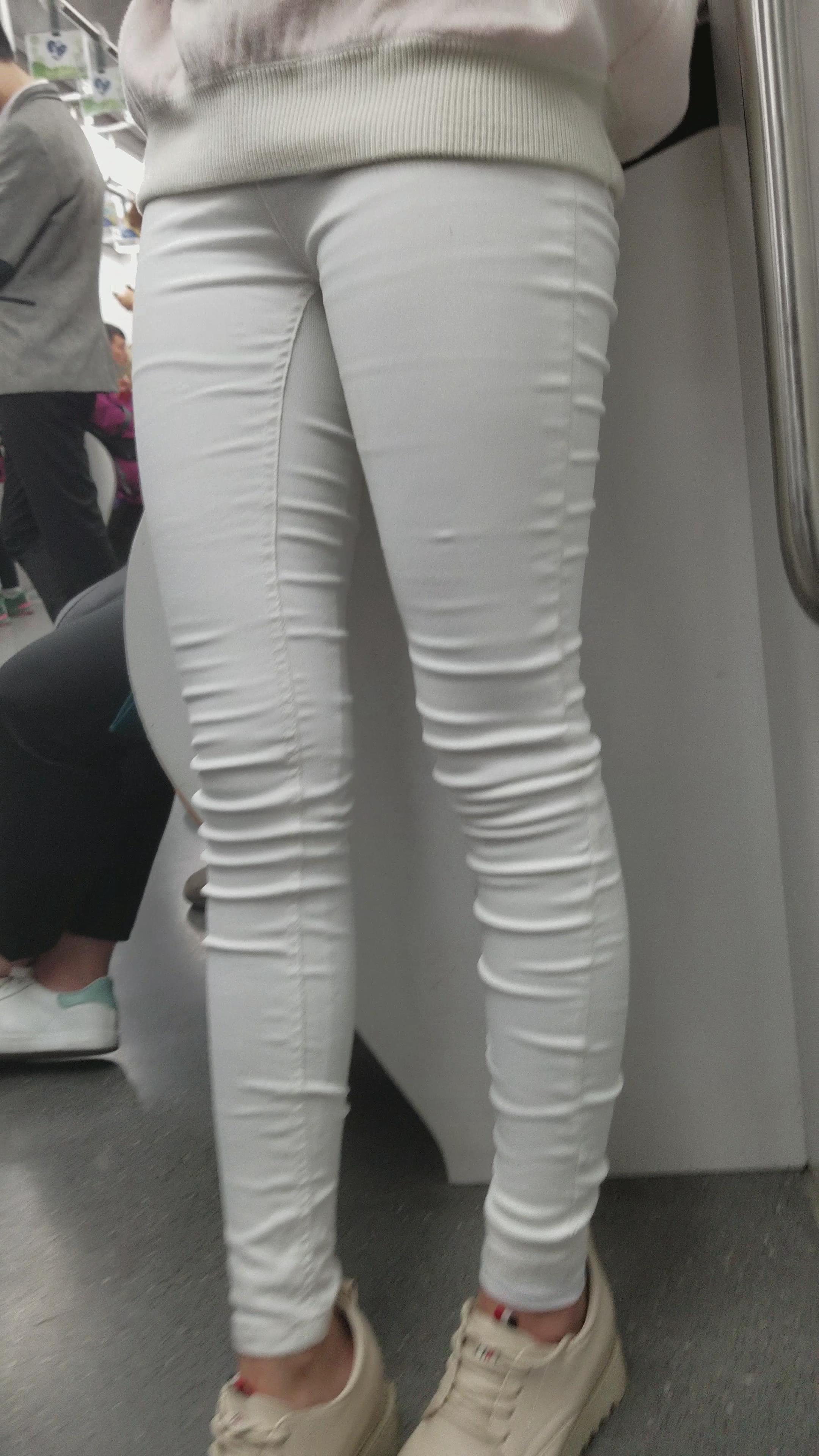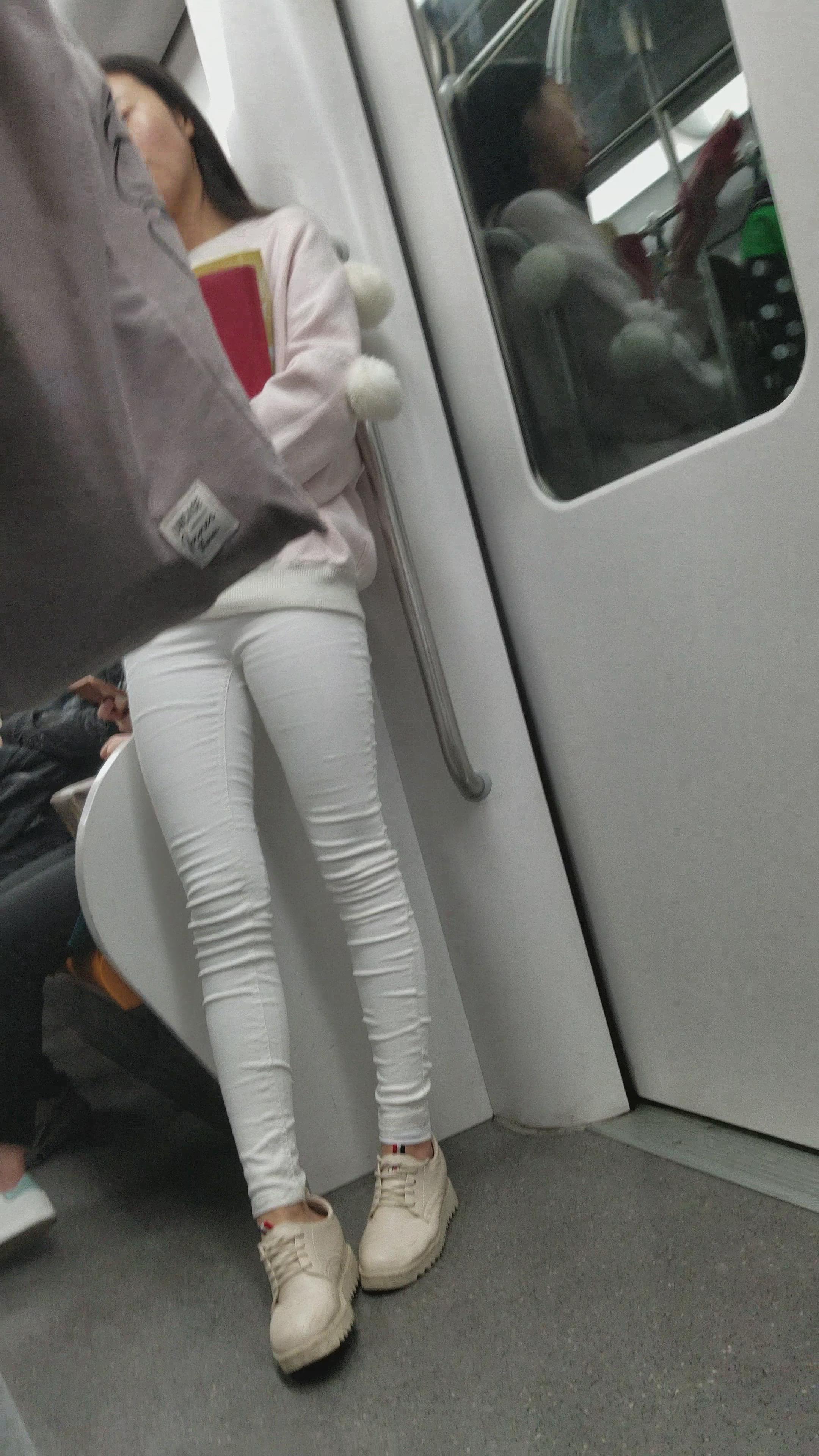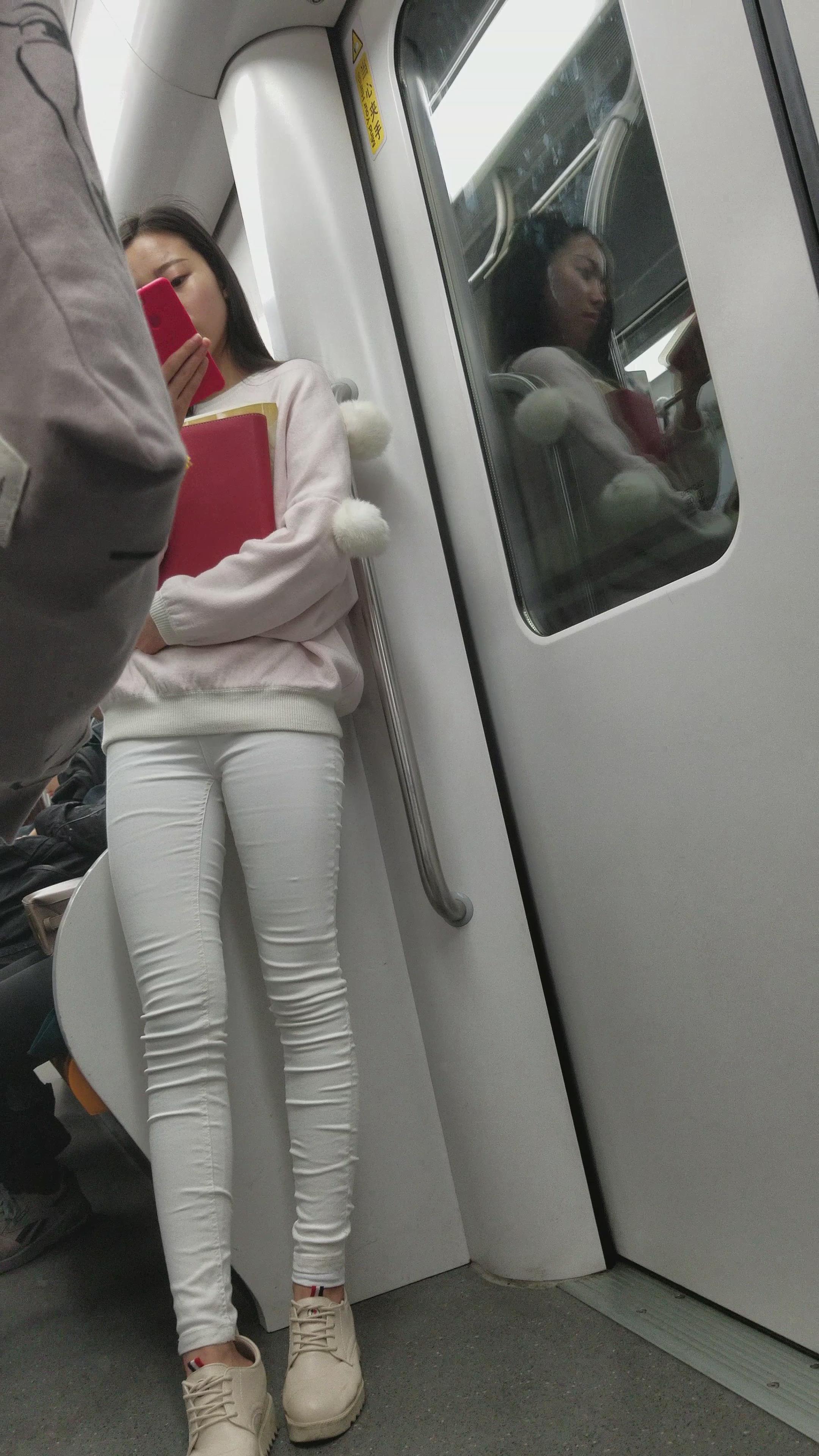 地铁上拍摄米色鞋长腿紧身白裤小姐姐 编号3117