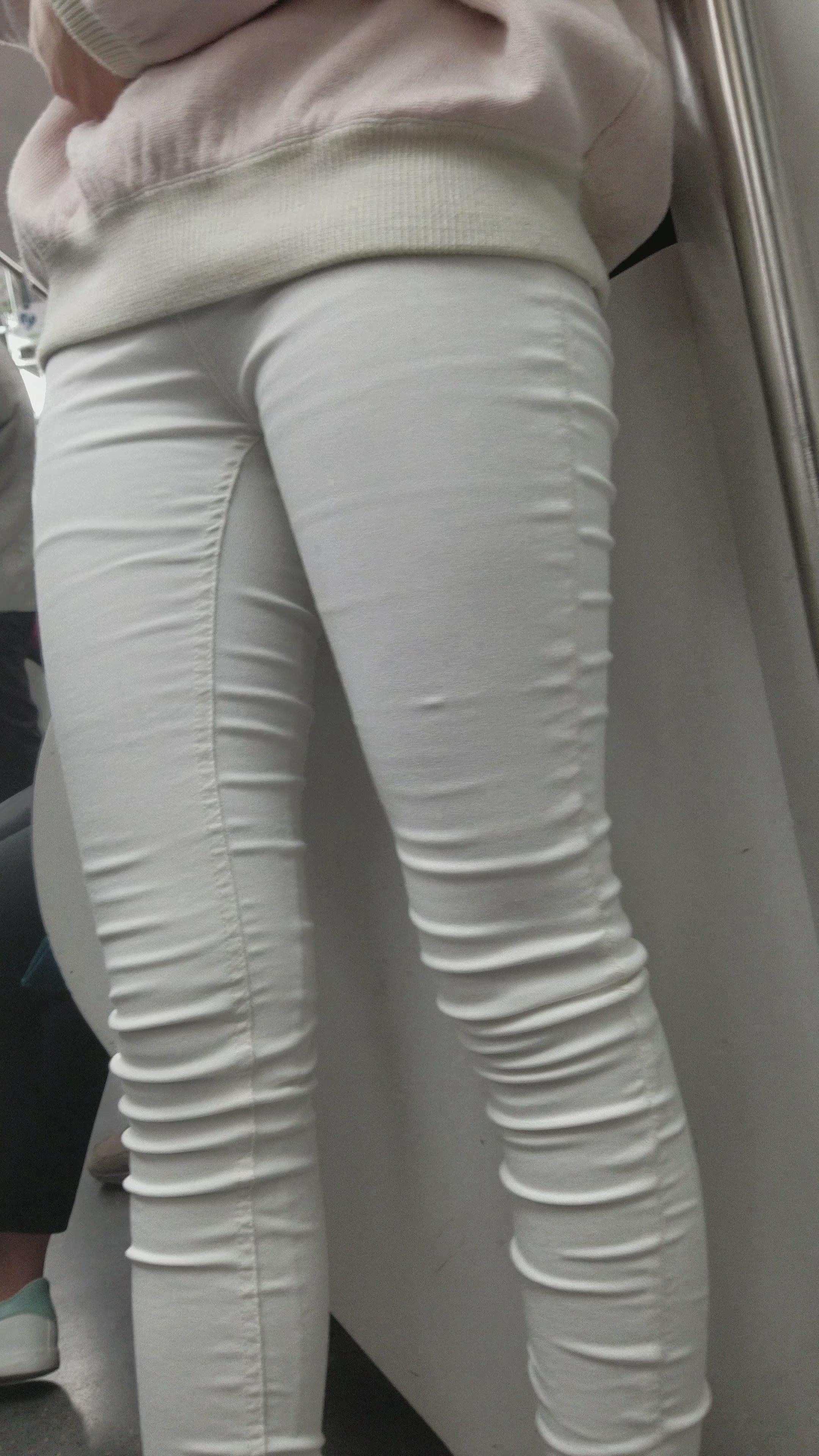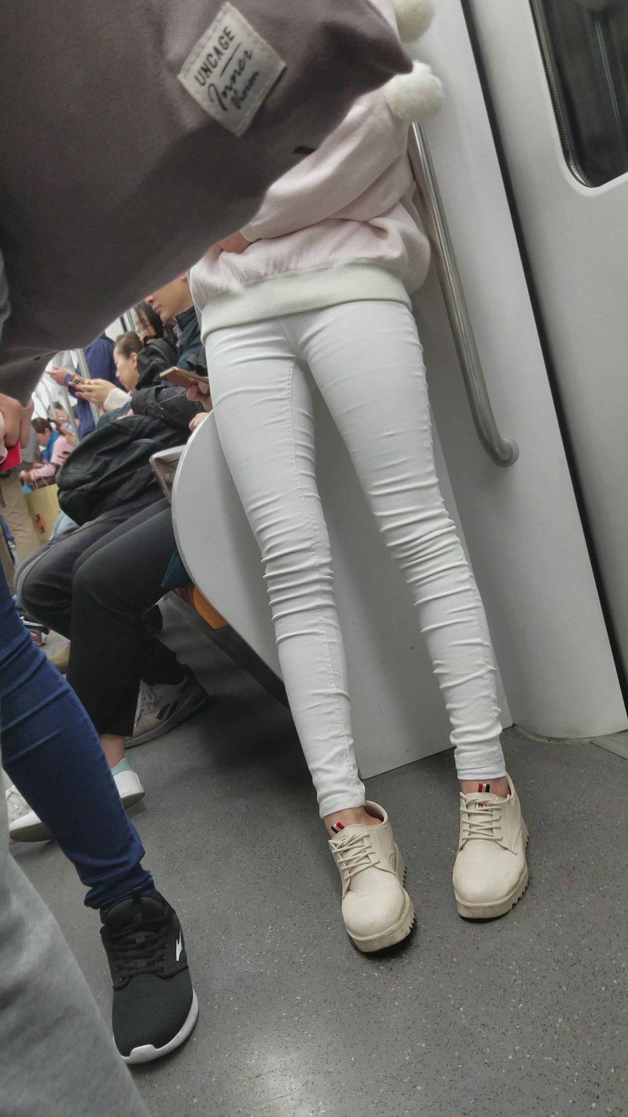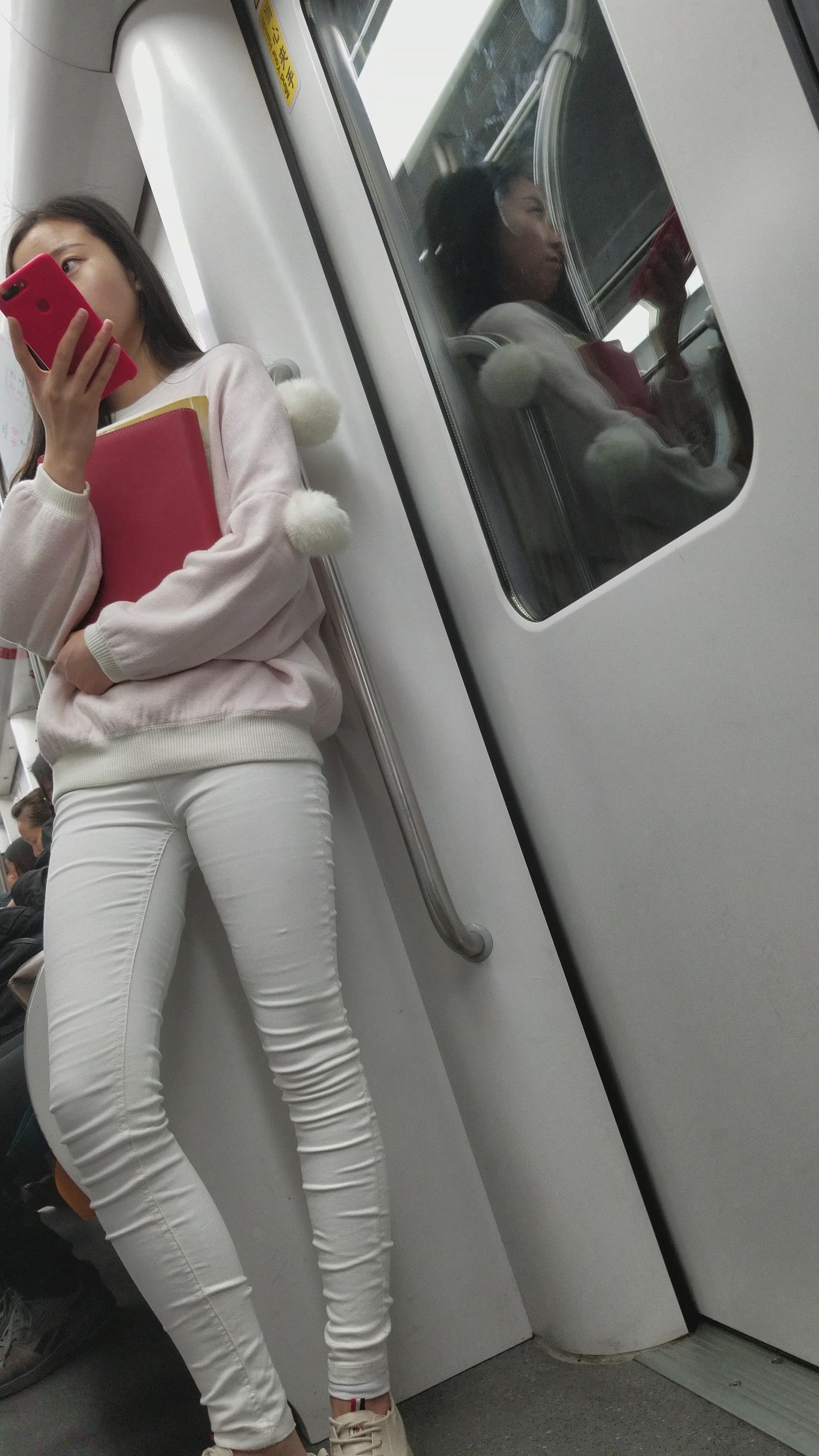 地铁上拍摄米色鞋长腿紧身白裤小姐姐 编号3117